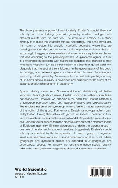 This book presents a powerful way to study Einstein's special theory of relativity and its underlying hyperbolic geometry in which analogies with classical results form the right tool. The premise of analogy as a study strategy is to make the unfamiliar familiar. Accordingly, this book introduces the notion of vectors into analytic hyperbolic geometry, where they are called gyrovectors. Gyrovectors turn out to be equivalence classes that add according to the gyroparallelogram law just as vectors are equivalence classes that add according to the parallelogram law. In the gyrolanguage of this book, accordingly, one prefixes a gyro to a classical term to mean the analogous term in hyperbolic geometry. As an example, the relativistic gyrotrigonometry of Einstein's special relativity is developed and employed to the study of the stellar aberration phenomenon in astronomy. Furthermore, the book presents, for the first time, the relativistic center of mass of an isolated system of noninteracting particles that coincided at some initial time t = 0. It turns out that the invariant mass of the relativistic center of mass of an expanding system (like galaxies) exceeds the sum of the masses of its constituent particles. This excess of mass suggests a viable mechanism for the formation of dark matter in the universe, which has not been detected but is needed to gravitationally "glue" each galaxy in the universe. The discovery of the relativistic center of mass in this book thus demonstrates once again the usefulness of the study of Einstein's special theory of relativity in terms of its underlying hyperbolic geometry.