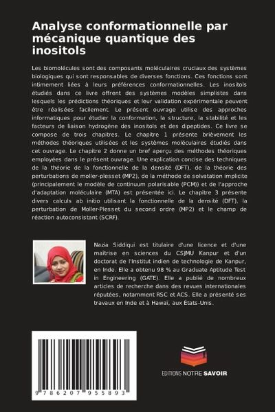 Les biomolécules sont des composants moléculaires cruciaux des systèmes biologiques qui sont responsables de diverses fonctions. Ces fonctions sont intimement liées à leurs préférences conformationnelles. Les inositols étudiés dans ce livre offrent des systèmes modèles simplistes dans lesquels les prédictions théoriques et leur validation expérimentale peuvent être réalisées facilement. Le présent ouvrage utilise des approches informatiques pour étudier la conformation, la structure, la stabilité et les facteurs de liaison hydrogène des inositols et des dipeptides. Ce livre se compose de trois chapitres. Le chapitre 1 présente brièvement les méthodes théoriques utilisées et les systèmes moléculaires étudiés dans cet ouvrage. Le chapitre 2 donne un bref aperçu des méthodes théoriques employées dans le présent ouvrage. Une explication concise des techniques de la théorie de la fonctionnelle de la densité (DFT), de la théorie des perturbations de moller-plesset (MP2), de la méthode de solvatation implicite (principalement le modèle de continuum polarisable (PCM)) et de l'approche d'adaptation moléculaire (MTA) est présentée ici. Le chapitre 3 présente divers calculs ab initio utilisant la fonctionnelle de la densité (DFT), la perturbation de Moller-Plesset du second ordre (MP2) et le champ de réaction autoconsistant (SCRF).