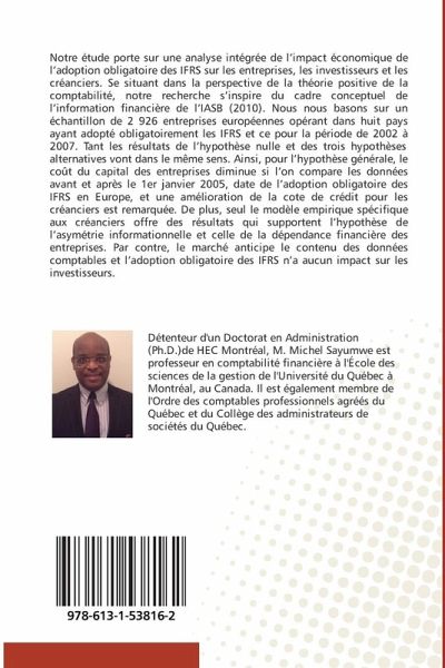 Notre étude porte sur une analyse intégrée de l'impact économique de l'adoption obligatoire des IFRS sur les entreprises, les investisseurs et les créanciers. Se situant dans la perspective de la théorie positive de la comptabilité, notre recherche s'inspire du cadre conceptuel de l'information financière de l'IASB (2010). Nous nous basons sur un échantillon de 2 926 entreprises européennes opérant dans huit pays ayant adopté obligatoirement les IFRS et ce pour la période de 2002 à 2007. Tant les résultats de l'hypothèse nulle et des trois hypothèses alternatives vont dans le même sens. Ainsi, pour l'hypothèse générale, le coût du capital des entreprises diminue si l'on compare les données avant et après le 1er janvier 2005, date de l'adoption obligatoire des IFRS en Europe, et une amélioration de la cote de crédit pour les créanciers est remarquée. De plus, seul le modèle empirique spécifique aux créanciers offre des résultats qui supportent l'hypothèse de l'asymétrie informationnelle et celle de la dépendance financière des entreprises. Par contre, le marché anticipe le contenu des données comptables et l'adoption obligatoire des IFRS n'a aucun impact sur les investisseurs.