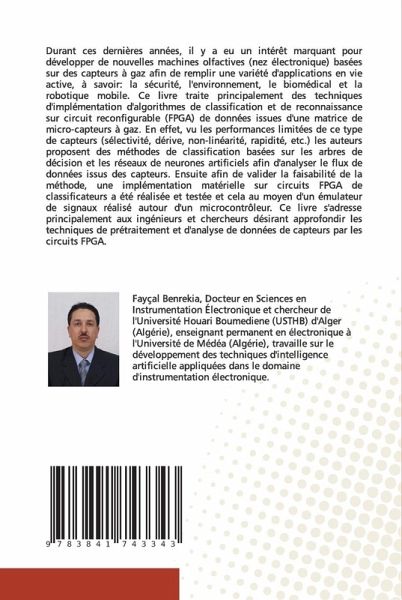 Durant ces dernières années, il y a eu un intérêt marquant pour développer de nouvelles machines olfactives (nez électronique) basées sur des capteurs à gaz afin de remplir une variété d'applications en vie active, à savoir: la sécurité, l'environnement, le biomédical et la robotique mobile. Ce livre traite principalement des techniques d'implémentation d'algorithmes de classification et de reconnaissance sur circuit reconfigurable (FPGA) de données issues d'une matrice de micro-capteurs à gaz. En effet, vu les performances limitées de ce type de capteurs (sélectivité, dérive, non-linéarité, rapidité, etc.) les auteurs proposent des méthodes de classification basées sur les arbres de décision et les réseaux de neurones artificiels afin d'analyser le flux de données issus des capteurs. Ensuite afin de valider la faisabilité de la méthode, une implémentation matérielle sur circuits FPGA de classificateurs a été réalisée et testée et cela au moyen d'un émulateur de signaux réalisé autour d'un microcontrôleur. Ce livre s'adresse principalement aux ingénieurs et chercheurs désirant approfondir les techniques de prétraitement et d'analyse de données de capteurs par les circuits FPGA.