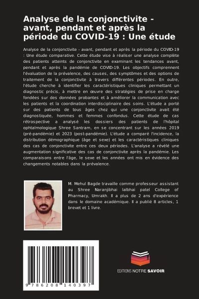 Analyse de la conjonctivite - avant, pendant et après la période du COVID-19 : Une étude comparative. Cette étude vise à réaliser une analyse complète des patients atteints de conjonctivite en examinant les tendances avant, pendant et après la pandémie de COVID-19. Les objectifs comprennent l'évaluation de la prévalence, des causes, des symptômes et des options de traitement de la conjonctivite à travers différentes périodes. En outre, l'étude cherche à identifier les caractéristiques cliniques permettant un diagnostic précis, à mettre en oeuvre des stratégies de prise en charge fondées sur des données probantes et à améliorer la communication avec les patients et la coordination interdisciplinaire des soins. L'étude a porté sur des patients de tous âges chez qui une conjonctivite avait été diagnostiquée, hommes et femmes confondus. Cette étude de cas rétrospective a analysé les dossiers des patients de l'hôpital ophtalmologique Shree Santram, en se concentrant sur les années 2019 (pré-pandémie) et 2023 (post-pandémie). L'étude a comparé l'incidence, la distribution démographique (âge et sexe) et les caractéristiques cliniques des cas de conjonctivite entre ces deux périodes. L'analyse a révélé une augmentation significative des cas de conjonctivite après la pandémie. Les comparaisons entre l'âge, le sexe et les années ont mis en évidence des changements notables dans la prévalence.