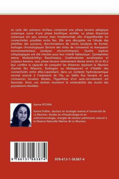 Le cycle des poissons récifaux comprend une phase larvaire pélagique océanique suivie d'une phase benthique récifale. La phase dispersive océanique est peu connue mais fondamentale afin d'appréhender les connectivités possibles entre îles. Elle sera décryptée via l'étude des otolithes des poissons, discriminateurs de stocks (analyses de forme), horloges chronologiques (lecture des stries de croissance) et marqueurs environnementaux (analyses microchimiques). Quatre espèces ichtyologiques ont été choisies pour leur intérêt halieutique : Epinephelus merra, Mulloidichthys flavolineatus, Gnathodentex aurolineatus et Lutjanus kasmira. Leur phase larvaire relativement élevée (entre 30 et 40 j) leur confère la capacité de conquérir les distances séparant la Réunion d'autres îles (Maurice, Rodrigues ou Madagascar) et d'établir des connectivités entre elles.Cependant, dans un contexte hydrodynamique normal associé à l'isolement de l'île, au faible flux larvaire et aux croissances larvaires élevées, l'hypothèse d'un auto-recrutement est favorisée. Ainsi, ces réultats montrent la vulnérabilité des stocks des populations étudiées.