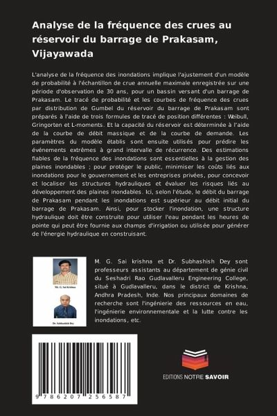 L'analyse de la fréquence des inondations implique l'ajustement d'un modèle de probabilité à l'échantillon de crue annuelle maximale enregistrée sur une période d'observation de 30 ans, pour un bassin versant d'un barrage de Prakasam. Le tracé de probabilité et les courbes de fréquence des crues par distribution de Gumbel du réservoir du barrage de Prakasam sont préparés à l'aide de trois formules de tracé de position différentes : Weibull, Gringorten et L-moments. Et la capacité du réservoir est déterminée à l'aide de la courbe de débit massique et de la courbe de demande. Les paramètres du modèle établis sont ensuite utilisés pour prédire les événements extrêmes à grand intervalle de récurrence. Des estimations fiables de la fréquence des inondations sont essentielles à la gestion des plaines inondables ; pour protéger le public, minimiser les coûts liés aux inondations pour le gouvernement et les entreprises privées, pour concevoir et localiser les structures hydrauliques et évaluer les risques liés au développement des plaines inondables. Ici, selon l'étude, le débit du barrage de Prakasam pendant les inondations est supérieur au débit initial du barrage de Prakasam. Ainsi, pour stocker l'inondation, une structure hydraulique doit être construite pour utiliser l'eau pendant les heures de pointe qui peut être fournie aux champs d'irrigation ou utilisée pour générer de l'énergie hydraulique en construisant.