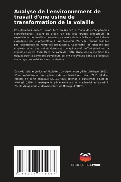 Ces dernières années, l'aviculture brésilienne a connu des changements extraordinaires, faisant du Brésil l'un des plus grands producteurs et exportateurs de volaille au monde. Le secteur de la volaille est passé d'une exploitation par le propriétaire à une économie d'échelle, rendue possible par l'association de nombreux producteurs. Cependant, les fonctions des employés n'ont pas été modernisées, ce qui accroît l'effort physique, la monotonie et les TMS. Dans ce contexte, cette étude vise à identifier les risques pour la santé des travailleurs qui ont été évalués dans le processus d'abattage des volailles dans un abattoir.