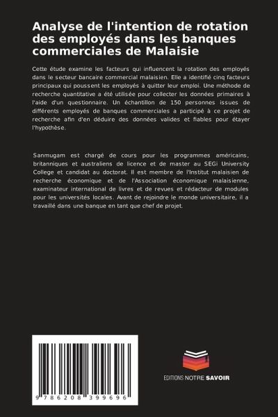 Cette étude examine les facteurs qui influencent la rotation des employés dans le secteur bancaire commercial malaisien. Elle a identifié cinq facteurs principaux qui poussent les employés à quitter leur emploi. Une méthode de recherche quantitative a été utilisée pour collecter les données primaires à l'aide d'un questionnaire. Un échantillon de 150 personnes issues de différents employés de banques commerciales a participé à ce projet de recherche afin d'en déduire des données valides et fiables pour étayer l'hypothèse.