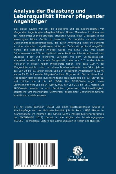 Ziel dieser Studie war es, die Belastung und die Lebensqualität von pflegenden Angehörigen pflegebedürftiger älterer Menschen in einem von der Familiengesundheitsstrategie erfassten Gebiet einer Großstadt in der Makroregion Minas Gerais zu bewerten. Es handelte sich um eine Querschnittsbeobachtungsstudie, die durch Anwendung eines Instruments an einer statistisch signifikanten einfachen Zufallsstichprobe durchgeführt wurde. Die statistische Analyse wurde mit SPSS 21.0 mit einem Evidenzniveau von 5 % durchgeführt, wobei kontinuierliche Variablen mit dem Student's t-Test und dichotome Variablen mit dem Chi-Quadrat-Test analysiert wurden. Es wurde festgestellt, dass nur 5,7 % der älteren Menschen in dieser Region Pflegekräfte haben, und dass 100 % der Pflegekräfte weiblich sind, mit einem Durchschnittsalter von 54,41 Jahren, das von 34 bis 81 Jahren reicht. Von den pflegenden Angehörigen (35,3 %) waren 23,53 % formelle Pflegekräfte über 60 Jahre alt. Die mit dem Zarit-Fragebogen gemessene durchschnittliche Belastung lag bei 33 (SD=15,81) und reichte von 4 bis 62 (0-88). Die SF-36-Skala ergab einen Durchschnittswert von 58,04 (SD=22,92), der von 21,2 bis 95,1 reichte. Die SF-36-Werte werden in acht Bereichen gemessen: Funktionsfähigkeit, körperliche Einschränkungen, Schmerzen, allgemeiner Gesundheitszustand, Vitalität und soziale Aspekte.