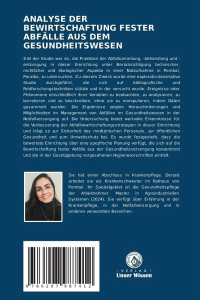 Ziel der Studie war es, die Praktiken der Abfallsammlung, -behandlung und -entsorgung in dieser Einrichtung unter Berücksichtigung technischer, rechtlicher und ökologischer Aspekte in einer Notaufnahme in Pombal, Paraíba, zu untersuchen. Zu diesem Zweck wurde eine explorativ-deskriptive Studie durchgeführt, die sich auf bibliografische und Feldforschungstechniken stützte und in der versucht wurde, Ereignisse oder Phänomene einschließlich ihrer Variablen zu beobachten, zu analysieren, zu korrelieren und zu beschreiben, ohne sie zu manipulieren, indem Daten gesammelt wurden. Die Ergebnisse zeigten Herausforderungen und Möglichkeiten im Management von Abfällen im Gesundheitswesen in der Notfallversorgung auf. Die Untersuchung bietet wertvolle Erkenntnisse für die Verbesserung der Abfallbewirtschaftungsstrategien in dieser Einrichtung und trägt so zur Sicherheit des medizinischen Personals, zur öffentlichen Gesundheit und zum Umweltschutz bei. Es wurde festgestellt, dass die bewertete Einrichtung über eine spezifische Planung verfügt, die sich auf die Bewirtschaftung fester Abfälle aus der Gesundheitsversorgung konzentriert und die in der Gesetzgebung vorgesehenen Hygienevorschriften einhält.