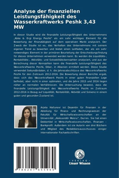 In dieser Studie wird die finanzielle Leistungsfähigkeit des Unternehmens "Koka & Ergi Energy Peshk" als ein sehr wichtiges Element für die Bewertung der Finanztätigkeit auf dem operativen Markt analysiert. Der Zweck der Studie ist es, das Verhalten des Unternehmens mit seinem eigenen Trend zu bewerten und bietet einen Leitfaden, der als ein sehr notwendiges Element in der primären Beurteilung der Entscheidungsfindung für dieses Unternehmen verwendet werden kann. Es werden die Liquiditäts-, Rentabilitäts-, Aktivitäts- und Solvabilitätskennzahlen analysiert, und aus der Berechnung dieser Kennzahlen kann die finanzielle Leistungsfähigkeit des Wasserkraftwerks Peshk, Diber, in Albanien ermittelt werden. Diese Studie verwendet Sekundärdaten, d. h. die Jahresabschlüsse des Wasserkraftwerks Peshk für den Zeitraum 2012-2016. Die Bewertung dieser Berichte ergab, dass sich das Wasserkraftwerk Peshk in einer guten finanziellen Lage befindet, aber nicht in einer optimalen, und die Jahre 2015 und 2016 liegen näher an normalen Verhältnissen. Die Untersuchung beweist, dass die finanzielle Leistungsfähigkeit des Wasserkraftwerks Peshk im Zeitraum 2012-2016 in Bezug auf Liquidität, Rentabilität, Aktivität und Solvenz in einem guten und gesunden Zustand ist.