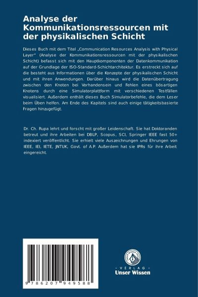 Dieses Buch mit dem Titel "Communication Resources Analysis with Physical Layer" (Analyse der Kommunikationsressourcen mit der physikalischen Schicht) befasst sich mit den Hauptkomponenten der Datenkommunikation auf der Grundlage der ISO-Standard-Schichtarchitektur. Es erstreckt sich auf die besteht aus Informationen über die Konzepte der physikalischen Schicht und mit ihren Anwendungen. Darüber hinaus wird die Datenübertragung zwischen den Knoten bei Vorhandensein und Fehlen eines bösartigen Knotens durch eine Simulatorplattform mit verschiedenen Testfällen visualisiert. Außerdem enthält dieses Buch Simulatorbefehle, die dem Leser beim Üben helfen. Am Ende des Kapitels sind auch einige tätigkeitsbasierte Fragen hinzugefügt.