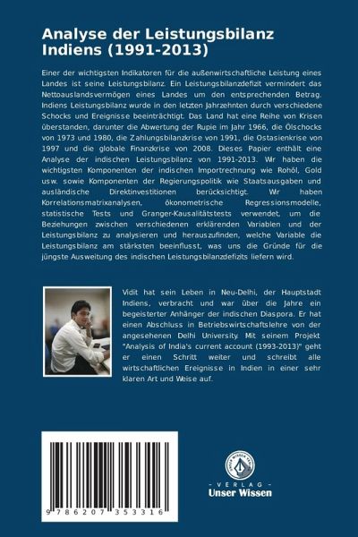 Einer der wichtigsten Indikatoren für die außenwirtschaftliche Leistung eines Landes ist seine Leistungsbilanz. Ein Leistungsbilanzdefizit vermindert das Nettoauslandsvermögen eines Landes um den entsprechenden Betrag. Indiens Leistungsbilanz wurde in den letzten Jahrzehnten durch verschiedene Schocks und Ereignisse beeinträchtigt. Das Land hat eine Reihe von Krisen überstanden, darunter die Abwertung der Rupie im Jahr 1966, die Ölschocks von 1973 und 1980, die Zahlungsbilanzkrise von 1991, die Ostasienkrise von 1997 und die globale Finanzkrise von 2008. Dieses Papier enthält eine Analyse der indischen Leistungsbilanz von 1991-2013. Wir haben die wichtigsten Komponenten der indischen Importrechnung wie Rohöl, Gold usw. sowie Komponenten der Regierungspolitik wie Staatsausgaben und ausländische Direktinvestitionen berücksichtigt. Wir haben Korrelationsmatrixanalysen, ökonometrische Regressionsmodelle, statistische Tests und Granger-Kausalitätstests verwendet, um die Beziehungen zwischen verschiedenen erklärenden Variablen und der Leistungsbilanz zu analysieren und herauszufinden, welche Variable die Leistungsbilanz am stärksten beeinflusst, was uns die Gründe für die jüngste Ausweitung des indischen Leistungsbilanzdefizits liefern wird.