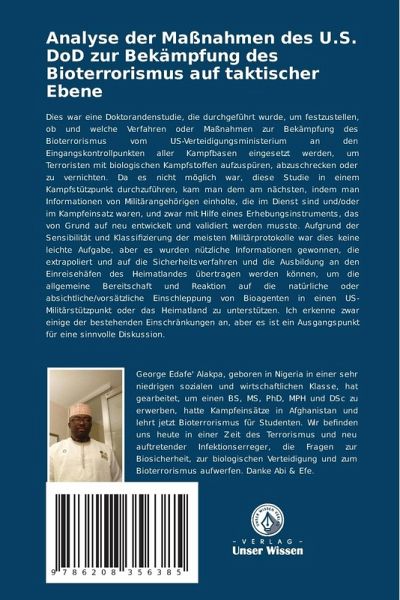 Dies war eine Doktorandenstudie, die durchgeführt wurde, um festzustellen, ob und welche Verfahren oder Maßnahmen zur Bekämpfung des Bioterrorismus vom US-Verteidigungsministerium an den Eingangskontrollpunkten aller Kampfbasen eingesetzt werden, um Terroristen mit biologischen Kampfstoffen aufzuspüren, abzuschrecken oder zu vernichten. Da es nicht möglich war, diese Studie in einem Kampfstützpunkt durchzuführen, kam man dem am nächsten, indem man Informationen von Militärangehörigen einholte, die im Dienst sind und/oder im Kampfeinsatz waren, und zwar mit Hilfe eines Erhebungsinstruments, das von Grund auf neu entwickelt und validiert werden musste. Aufgrund der Sensibilität und Klassifizierung der meisten Militärprotokolle war dies keine leichte Aufgabe, aber es wurden nützliche Informationen gewonnen, die extrapoliert und auf die Sicherheitsverfahren und die Ausbildung an den Einreisehäfen des Heimatlandes übertragen werden können, um die allgemeine Bereitschaft und Reaktion auf die natürliche oder absichtliche/vorsätzliche Einschleppung von Bioagenten in einen US-Militärstützpunkt oder das Heimatland zu unterstützen. Ich erkenne zwar einige der bestehenden Einschränkungen an, aber es ist ein Ausgangspunkt für eine sinnvolle Diskussion.