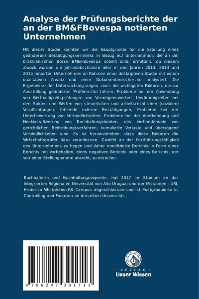 Mit dieser Studie konnten wir die Hauptgründe für die Erteilung eines geänderten Bestätigungsvermerks in Bezug auf Unternehmen, die an der brasilianischen Börse BM&FBovespa notiert sind, ermitteln. Zu diesem Zweck wurden die Jahresabschlüsse aller in den Jahren 2013, 2014 und 2015 notierten Unternehmen im Rahmen einer deskriptiven Studie mit einem qualitativen Ansatz und einer Dokumentenrecherche analysiert. Die Ergebnisse der Untersuchung zeigen, dass die wichtigsten Faktoren, die zur Ausstellung geänderter Prüfberichte führen, Probleme bei der Anwendung von Werthaltigkeitsprüfungen von Vermögenswerten, Unstimmigkeiten bei den Salden und Werten von steuerlichen und arbeitsrechtlichen (sozialen) Verpflichtungen, fehlende externe Bestätigungen, Probleme bei der Unterbewertung von Verbindlichkeiten, Probleme bei der Anerkennung und Neuklassifizierung von Buchhaltungskonten, das Vorhandensein von gerichtlichen Beitreibungsverfahren, kumulierte Verluste und überzogene Verbindlichkeiten sind. Es ist hervorzuheben, dass diese Faktoren die Wirtschaftsprüfer dazu veranlassen, Zweifel an der Fortführungsfähigkeit des Unternehmens zu hegen und daher modifizierte Berichte in Form eines Berichts mit Vorbehalten, eines negativen Berichts oder eines Berichts, der von einer Stellungnahme absieht, zu erstellen.