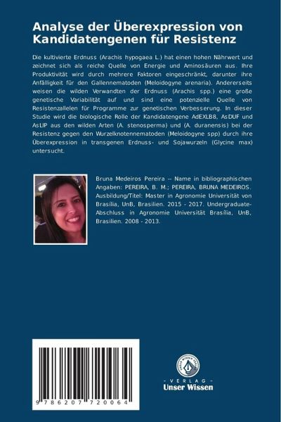 Die kultivierte Erdnuss (Arachis hypogaea L.) hat einen hohen Nährwert und zeichnet sich als reiche Quelle von Energie und Aminosäuren aus. Ihre Produktivität wird durch mehrere Faktoren eingeschränkt, darunter ihre Anfälligkeit für den Gallennematoden (Meloidogyne arenaria). Andererseits weisen die wilden Verwandten der Erdnuss (Arachis spp.) eine große genetische Variabilität auf und sind eine potenzielle Quelle von Resistenzallelen für Programme zur genetischen Verbesserung. In dieser Studie wird die biologische Rolle der Kandidatengene AdEXLB8, AsDUF und AsLIP aus den wilden Arten (A. stenosperma) und (A. duranensis) bei der Resistenz gegen den Wurzelknotennematoden (Meloidogyne spp) durch ihre Überexpression in transgenen Erdnuss- und Sojawurzeln (Glycine max) untersucht.