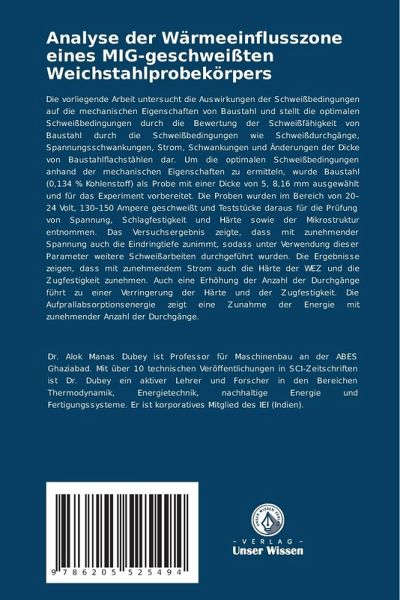 Die vorliegende Arbeit untersucht die Auswirkungen der Schweißbedingungen auf die mechanischen Eigenschaften von Baustahl und stellt die optimalen Schweißbedingungen durch die Bewertung der Schweißfähigkeit von Baustahl durch die Schweißbedingungen wie Schweißdurchgänge, Spannungsschwankungen, Strom, Schwankungen und Änderungen der Dicke von Baustahlflachstählen dar. Um die optimalen Schweißbedingungen anhand der mechanischen Eigenschaften zu ermitteln, wurde Baustahl (0,134 % Kohlenstoff) als Probe mit einer Dicke von 5, 8,16 mm ausgewählt und für das Experiment vorbereitet. Die Proben wurden im Bereich von 20-24 Volt, 130-150 Ampere geschweißt und Teststücke daraus für die Prüfung von Spannung, Schlagfestigkeit und Härte sowie der Mikrostruktur entnommen. Das Versuchsergebnis zeigte, dass mit zunehmender Spannung auch die Eindringtiefe zunimmt, sodass unter Verwendung dieser Parameter weitere Schweißarbeiten durchgeführt wurden. Die Ergebnisse zeigen, dass mit zunehmendem Stromauch die Härte der WEZ und die Zugfestigkeit zunehmen. Auch eine Erhöhung der Anzahl der Durchgänge führt zu einer Verringerung der Härte und der Zugfestigkeit. Die Aufprallabsorptionsenergie zeigt eine Zunahme der Energie mit zunehmender Anzahl der Durchgänge.