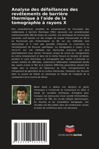 Une compréhension complète du comportement de fissuration des revêtements à barrière thermique (TBC) nécessite une caractérisation tridimensionnelle (3D) de toutes les couches. Les techniques de microscopie courantes sont basées sur des images de coupes transversales en 2D et ne fournissent pas d'informations en 3D, car ces méthodes sont destructives et il n'est pas possible d'observer la croissance ou l'enchaînement de fissures spécifiques. La tomographie à rayons X ou micro-CT est une méthode non destructive précieuse qui peut potentiellement nous donner l'occasion unique de suivre les changements du même emplacement et donc de la même fissure en fonction du temps pendant le cycle thermique. La tomographie par rayons X présente un certain nombre de difficultés, notamment l'atténuation relativement élevée des rayons X dans le TBC et le substrat. Différents paramètres doivent être réglés pour la mesure de l'épaisseur du TGO, l'enregistrement du changement de géométrie de la surface interfaciale, l'évolution des fissures dans la couche de finition en céramique et l'étude de l'intégrité de la composition de la couche de liaison.