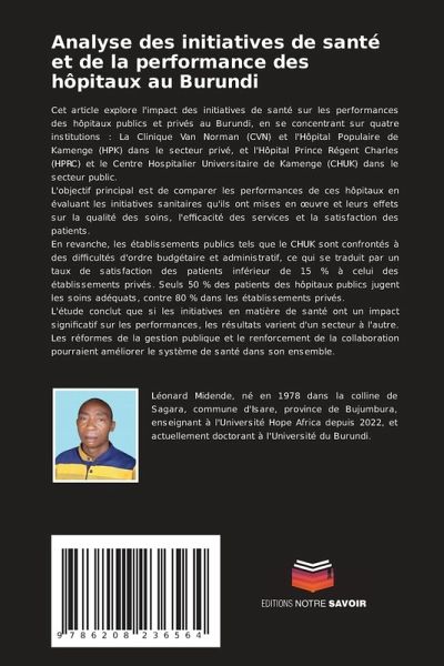 Cet article explore l'impact des initiatives de santé sur les performances des hôpitaux publics et privés au Burundi, en se concentrant sur quatre institutions : La Clinique Van Norman (CVN) et l'Hôpital Populaire de Kamenge (HPK) dans le secteur privé, et l'Hôpital Prince Régent Charles (HPRC) et le Centre Hospitalier Universitaire de Kamenge (CHUK) dans le secteur public.L'objectif principal est de comparer les performances de ces hôpitaux en évaluant les initiatives sanitaires qu'ils ont mises en oeuvre et leurs effets sur la qualité des soins, l'efficacité des services et la satisfaction des patients.En revanche, les établissements publics tels que le CHUK sont confrontés à des difficultés d'ordre budgétaire et administratif, ce qui se traduit par un taux de satisfaction des patients inférieur de 15 % à celui des établissements privés. Seuls 50 % des patients des hôpitaux publics jugent les soins adéquats, contre 80 % dans les établissements privés.L'étude conclut que si les initiatives en matière de santé ont un impact significatif sur les performances, les résultats varient d'un secteur à l'autre. Les réformes de la gestion publique et le renforcement de la collaboration pourraient améliorer le système de santé dans son ensemble.
