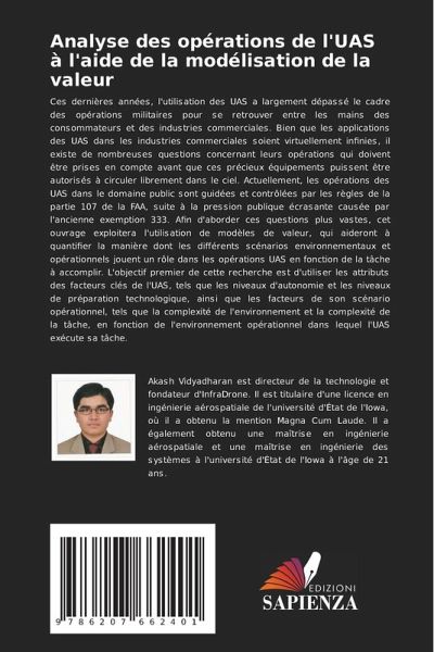 Ces dernières années, l'utilisation des UAS a largement dépassé le cadre des opérations militaires pour se retrouver entre les mains des consommateurs et des industries commerciales. Bien que les applications des UAS dans les industries commerciales soient virtuellement infinies, il existe de nombreuses questions concernant leurs opérations qui doivent être prises en compte avant que ces précieux équipements puissent être autorisés à circuler librement dans le ciel. Actuellement, les opérations des UAS dans le domaine public sont guidées et contrôlées par les règles de la partie 107 de la FAA, suite à la pression publique écrasante causée par l'ancienne exemption 333. Afin d'aborder ces questions plus vastes, cet ouvrage exploitera l'utilisation de modèles de valeur, qui aideront à quantifier la manière dont les différents scénarios environnementaux et opérationnels jouent un rôle dans les opérations UAS en fonction de la tâche à accomplir. L'objectif premier de cette recherche est d'utiliser les attributs des facteurs clés de l'UAS, tels que les niveaux d'autonomie et les niveaux de préparation technologique, ainsi que les facteurs de son scénario opérationnel, tels que la complexité de l'environnement et la complexité de la tâche, en fonction de l'environnement opérationnel dans lequel l'UAS exécute sa tâche.