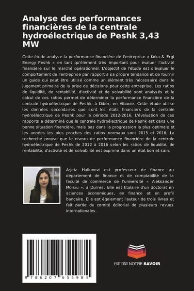 Cette étude analyse la performance financière de l'entreprise « Koka & Ergi Energy Peshk » en tant qu'élément très important pour évaluer l'activité financière sur le marché opérationnel. L'objectif de l'étude est d'évaluer le comportement de l'entreprise par rapport à sa propre tendance et de fournir un guide qui peut être utilisé comme un élément très nécessaire dans le jugement primaire de la prise de décisions pour cette entreprise. Les ratios de liquidité, de rentabilité, d'activité et de solvabilité sont analysés et le calcul de ces ratios permet de déterminer la performance financière de la centrale hydroélectrique de Peshk, à Diber, en Albanie. Cette étude utilise les données secondaires que sont les états financiers de la centrale hydroélectrique de Peshk pour la période 2012-2016. L'évaluation de ces rapports a déterminé que la centrale hydroélectrique de Peshk est dans une bonne situation financière, mais pas dans la progression la plus optimale et les années les plus proches des ratios normaux sont 2015 et 2016. La recherche prouve que le niveau de performance financière de la centrale hydroélectrique de Peshk de 2012 à 2016 selon les ratios de liquidité, de rentabilité, d'activité et de solvabilité est exprimé dans un état bon et sain.