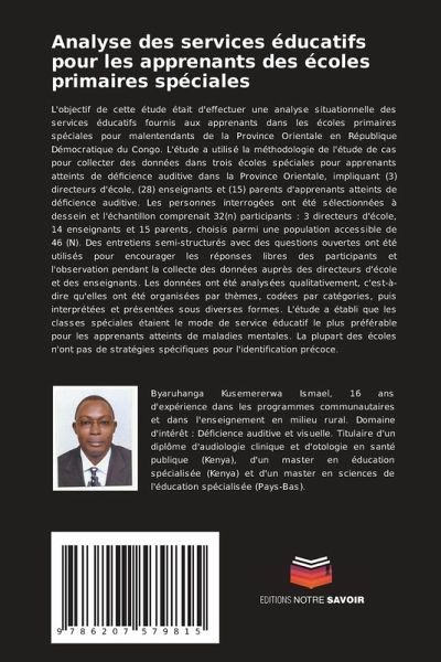L'objectif de cette étude était d'effectuer une analyse situationnelle des services éducatifs fournis aux apprenants dans les écoles primaires spéciales pour malentendants de la Province Orientale en République Démocratique du Congo. L'étude a utilisé la méthodologie de l'étude de cas pour collecter des données dans trois écoles spéciales pour apprenants atteints de déficience auditive dans la Province Orientale, impliquant (3) directeurs d'école, (28) enseignants et (15) parents d'apprenants atteints de déficience auditive. Les personnes interrogées ont été sélectionnées à dessein et l'échantillon comprenait 32(n) participants : 3 directeurs d'école, 14 enseignants et 15 parents, choisis parmi une population accessible de 46 (N). Des entretiens semi-structurés avec des questions ouvertes ont été utilisés pour encourager les réponses libres des participants et l'observation pendant la collecte des données auprès des directeurs d'école et des enseignants. Les données ont été analysées qualitativement, c'est-à-dire qu'elles ont été organisées par thèmes, codées par catégories, puis interprétées et présentées sous diverses formes. L'étude a établi que les classes spéciales étaient le mode de service éducatif le plus préférable pour les apprenants atteints de maladies mentales. La plupart des écoles n'ont pas de stratégies spécifiques pour l'identification précoce.