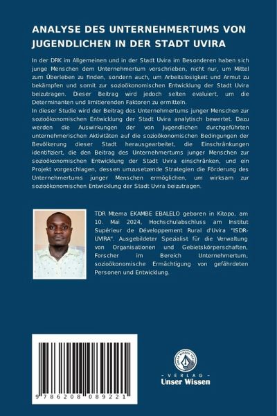 In der DRK im Allgemeinen und in der Stadt Uvira im Besonderen haben sich junge Menschen dem Unternehmertum verschrieben, nicht nur, um Mittel zum Überleben zu finden, sondern auch, um Arbeitslosigkeit und Armut zu bekämpfen und somit zur sozioökonomischen Entwicklung der Stadt Uvira beizutragen. Dieser Beitrag wird jedoch selten evaluiert, um die Determinanten und limitierenden Faktoren zu ermitteln. In dieser Studie wird der Beitrag des Unternehmertums junger Menschen zur sozioökonomischen Entwicklung der Stadt Uvira analytisch bewertet. Dazu werden die Auswirkungen der von Jugendlichen durchgeführten unternehmerischen Aktivitäten auf die sozioökonomischen Bedingungen der Bevölkerung dieser Stadt herausgearbeitet, die Einschränkungen identifiziert, die den Beitrag des Unternehmertums junger Menschen zur sozioökonomischen Entwicklung der Stadt Uvira einschränken, und ein Projekt vorgeschlagen, dessen umzusetzende Strategien die Förderung des Unternehmertums junger Menschen ermöglichen, um wirksam zur sozioökonomischen Entwicklung der Stadt Uvira beizutragen.