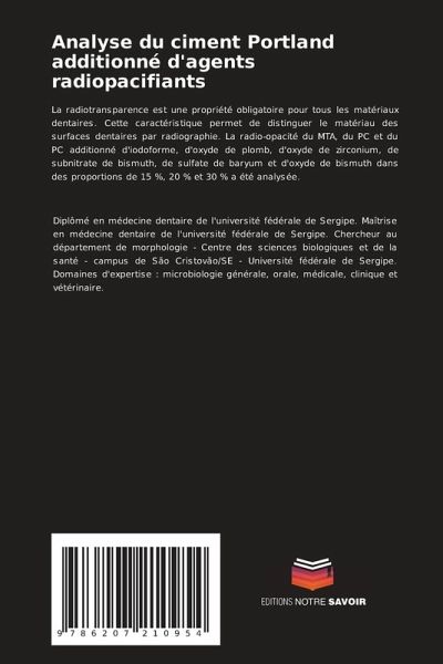 La radiotransparence est une propriété obligatoire pour tous les matériaux dentaires. Cette caractéristique permet de distinguer le matériau des surfaces dentaires par radiographie. La radio-opacité du MTA, du PC et du PC additionné d'iodoforme, d'oxyde de plomb, d'oxyde de zirconium, de subnitrate de bismuth, de sulfate de baryum et d'oxyde de bismuth dans des proportions de 15 %, 20 % et 30 % a été analysée.