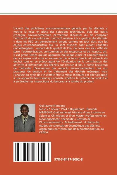 L'acuité des problèmes environnementaux générés par les déchets a motivé la mise en place des solutions techniques, puis des outils d'analyse environnementale permettant d'évaluer ou de comparer l'efficacité de ces solutions. L'activité relative à la « gestion des déchets » dans les PED est généralement perçue comme un tout alors que les enjeux environnementaux qui lui sont associés sont autant variables qu'hétérogènes : respect de la qualité de l'air, de l'eau, des sols, effet de serre, l'eutrophisation, consommation des ressources et de l'espace, etc. Il est grand temps qu'une approche holistique claire et compréhensible de ces enjeux soit mise en oeuvre par les acteurs directs et indirects du déchet tout en se préoccupant de l'évaluation de la contribution des activités d'élimination des déchets sur chacun d'eux. Il existe beaucoup de méthodes d'évaluation des impacts environnementaux liés aux pratiques de gestion et de traitement des déchets ménagers mais l'analyse du cycle de vie semble être la mieux indiquée car elle fait appel à une approche holistique qui consiste à définir le système du produit et à en étudier les interactions du berceau à la tombe du produit.
