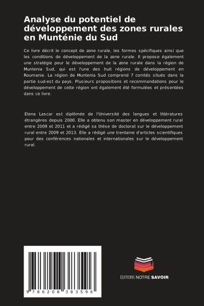 Ce livre décrit le concept de zone rurale, les formes spécifiques ainsi que les conditions de développement de la zone rurale. Il propose également une stratégie pour le développement de la zone rurale dans la région de Muntenia Sud, qui est l'une des huit régions de développement en Roumanie. La région de Muntenia Sud comprend 7 comtés situés dans la partie sud-est du pays. Plusieurs propositions et recommandations pour le développement de cette région ont également été formulées et présentées dans ce livre.