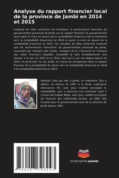 L'objectif de cette recherche est d'analyser la performance financière du gouvernement provincial de Jambi sur le rapport financier du gouvernement local avant la mise en oeuvre de la comptabilité d'exercice (de la trésorerie vers la comptabilité d'exercice) en 2014 et après la mise en oeuvre de la comptabilité d'exercice en 2015. Les résultats de cette recherche montrent que les performances financières du gouvernement provincial de Jambi, mesurées par l'analyse des écarts, l'analyse de la croissance et l'analyse des ratios financiers (liquidité, solvabilité et ratio d'endettement) sont bonnes à la fois en 2014 et en 2015, bien qu'il y ait une légère baisse en 2015, en particulier sur les actifs, en raison du changement dans le rapport financier de la comptabilité de caisse vers la comptabilité d'exercice en 2014 à la comptabilité d'exercice en 2015.