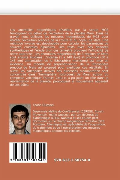 Les anomalies magnétiques révélées par la sonde MGS témoignent du début de l''évolution de la planète Mars. Dans ce travail nous utilisons les mesures magnétiques de MGS pour étudier l''évolution précoce de la croûte et du noyau de Mars. Une méthode inverse est développée pour calculer les paramètres de sources crustales dipolaires. Des tests avec des données synthétiques et l''étude d''un cas terrestre prouvent l''efficacité de notre approche. Les anomalies magnétiques de 3 régions de Mars sont ensuite étudiées. L''intense (1 à 140 A/m) et profonde (30 à 145 km) aimantation de la lithosphère martienne est mise en évidence. Un modèle de serpentinisation de la lithosphère précoce de Mars est proposé pour expliquer ces résultats. En outre, les paléopôles dérivés des directions d''aimantation sont concentrés dans l''hémisphère nord-ouest de Mars, autour du complexe volcanique Tharsis. Celui-ci a pu jouer un rôle dans la réorientation de la planète, provoquant le mouvement apparent de ces pôles.