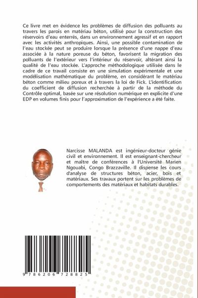 Ce livre met en évidence les problèmes de diffusion des polluants au travers les parois en matériau béton, utilisé pour la construction des réservoirs d'eau enterrés, dans un environnement agressif et en rapport avec les activités anthropiques. Ainsi, une possible contamination de l'eau stockée peut se produire lorsque la présence d'une nappe d'eau associée à la nature poreuse du béton, favorisent la migration des polluants de l'extérieur vers l'intérieur du réservoir, altérant ainsi la qualité de l'eau stockée. L'approche méthodologique utilisée dans le cadre de ce travail consiste en une simulation expérimentale et une modélisation mathématique du problème, en considérant le matériau béton comme milieu poreux et à travers la loi de Fick. L'identification du coefficient de diffusion recherchée à partir de la méthode du Contrôle optimal, basée sur une résolution numérique en explicite d'une EDP en volumes finis pour l'approximation de l'expérience a été faite.