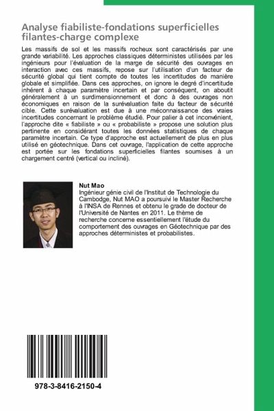 Les massifs de sol et les massifs rocheux sont caractérisés par une grande variabilité. Les approches classiques déterministes utilisées par les ingénieurs pour l évaluation de la marge de sécurité des ouvrages en interaction avec ces massifs, repose sur l utilisation d un facteur de sécurité global qui tient compte de toutes les incertitudes de manière globale et simplifiée. Dans ces approches, on ignore le degré d incertitude inhérent à chaque paramètre incertain et par conséquent, on aboutit généralement à un surdimensionnement et donc à des ouvrages non économiques en raison de la surévaluation faite du facteur de sécurité cible. Cette surévaluation est due à une méconnaissance des vraies incertitudes concernant le problème étudié. Pour palier à cet inconvénient, l approche dite " fiabiliste " ou " probabiliste " propose une solution plus pertinente en considérant toutes les données statistiques de chaque paramètre incertain. Ce type d approche est actuellement de plus en plus utilisé en géotechnique. Dans cet ouvrage, l'application de cette approche est portée sur les fondations superficielles filantes soumises à un chargement centré (vertical ou incliné).