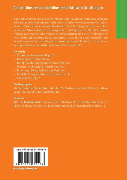 Ein Kompendium, das die in der Elektrotechnik, Mechatronik usw. üblichen Schaltungs-Analyseverfahren sehr übersichtlich nebeneinander stellt und erläutert. Dabei werden "Verwandtschaften" und Einsatzgebiete der verschiedenen Verfahren deutlich herausgestellt und abgegrenzt. Darüber hinaus werden auch numerische Verfahren berücksichtigt und es wird dargestellt, wie Schaltungssimulatoren funktionieren. An Hand einer kostenlos aus dem Internet zu beziehenden Demoversion des Schaltungssimulators LTspice wird dem Leser auch praktisches "Simulations-Know-How" vermittelt. Das Buch ist besonders für Studierende in Bachelorstudiengängen geeignet.