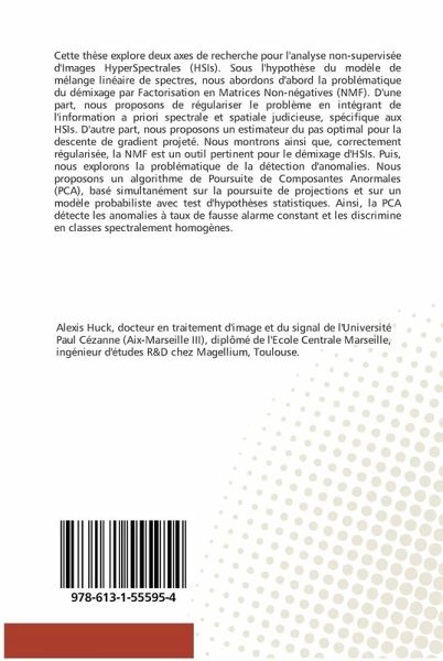 Cette thèse explore deux axes de recherche pour l'analyse non-supervisée d'Images HyperSpectrales (HSIs). Sous l'hypothèse du modèle de mélange linéaire de spectres, nous abordons d'abord la problématique du démixage par Factorisation en Matrices Non-négatives (NMF). D'une part, nous proposons de régulariser le problème en intégrant de l'information a priori spectrale et spatiale judicieuse, spécifique aux HSIs. D'autre part, nous proposons un estimateur du pas optimal pour la descente de gradient projeté. Nous montrons ainsi que, correctement régularisée, la NMF est un outil pertinent pour le démixage d'HSIs. Puis, nous explorons la problématique de la détection d'anomalies. Nous proposons un algorithme de Poursuite de Composantes Anormales (PCA), basé simultanément sur la poursuite de projections et sur un modèle probabiliste avec test d'hypothèses statistiques. Ainsi, la PCA détecte les anomalies à taux de fausse alarme constant et les discrimine en classes spectralement homogènes.