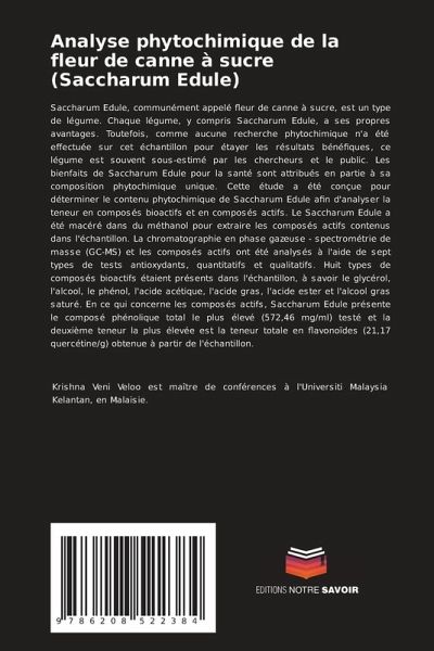 Saccharum Edule, communément appelé fleur de canne à sucre, est un type de légume. Chaque légume, y compris Saccharum Edule, a ses propres avantages. Toutefois, comme aucune recherche phytochimique n'a été effectuée sur cet échantillon pour étayer les résultats bénéfiques, ce légume est souvent sous-estimé par les chercheurs et le public. Les bienfaits de Saccharum Edule pour la santé sont attribués en partie à sa composition phytochimique unique. Cette étude a été conçue pour déterminer le contenu phytochimique de Saccharum Edule afin d'analyser la teneur en composés bioactifs et en composés actifs. Le Saccharum Edule a été macéré dans du méthanol pour extraire les composés actifs contenus dans l'échantillon. La chromatographie en phase gazeuse - spectrométrie de masse (GC-MS) et les composés actifs ont été analysés à l'aide de sept types de tests antioxydants, quantitatifs et qualitatifs. Huit types de composés bioactifs étaient présents dans l'échantillon, à savoir le glycérol, l'alcool, le phénol, l'acide acétique, l'acide gras, l'acide ester et l'alcool gras saturé. En ce qui concerne les composés actifs, Saccharum Edule présente le composé phénolique total le plus élevé (572,46 mg/ml) testé et la deuxième teneur la plus élevée est la teneur totale en flavonoïdes (21,17 quercétine/g) obtenue à partir de l'échantillon.