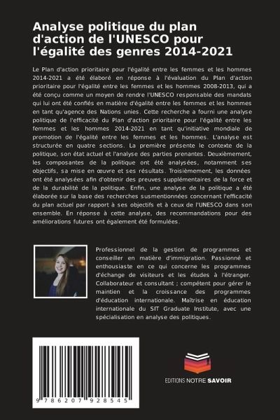 Le Plan d'action prioritaire pour l'égalité entre les femmes et les hommes 2014-2021 a été élaboré en réponse à l'évaluation du Plan d'action prioritaire pour l'égalité entre les femmes et les hommes 2008-2013, qui a été conçu comme un moyen de rendre l'UNESCO responsable des mandats qui lui ont été confiés en matière d'égalité entre les femmes et les hommes en tant qu'agence des Nations unies. Cette recherche a fourni une analyse politique de l'efficacité du Plan d'action prioritaire pour l'égalité entre les femmes et les hommes 2014-2021 en tant qu'initiative mondiale de promotion de l'égalité entre les femmes et les hommes. L'analyse est structurée en quatre sections. La première présente le contexte de la politique, son état actuel et l'analyse des parties prenantes. Deuxièmement, les composantes de la politique ont été analysées, notamment ses objectifs, sa mise en oeuvre et ses résultats. Troisièmement, les données ont été analysées afin d'obtenir des preuves supplémentaires de la force et de la durabilité de la politique. Enfin, une analyse de la politique a été élaborée sur la base des recherches susmentionnées concernant l'efficacité du plan actuel par rapport à ses objectifs et à ceux de l'UNESCO dans son ensemble. En réponse à cette analyse, des recommandations pour des améliorations futures ont également été formulées.