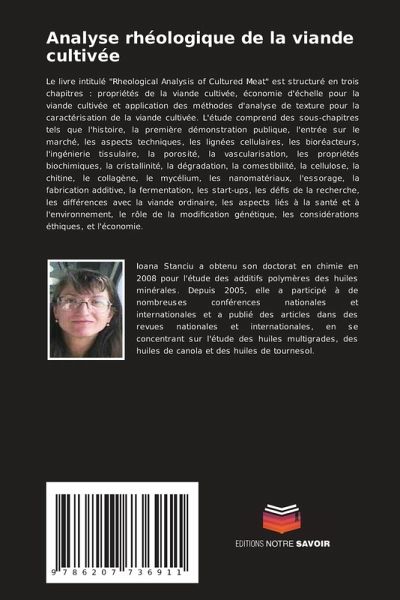 Le livre intitulé "Rheological Analysis of Cultured Meat" est structuré en trois chapitres : propriétés de la viande cultivée, économie d'échelle pour la viande cultivée et application des méthodes d'analyse de texture pour la caractérisation de la viande cultivée. L'étude comprend des sous-chapitres tels que l'histoire, la première démonstration publique, l'entrée sur le marché, les aspects techniques, les lignées cellulaires, les bioréacteurs, l'ingénierie tissulaire, la porosité, la vascularisation, les propriétés biochimiques, la cristallinité, la dégradation, la comestibilité, la cellulose, la chitine, le collagène, le mycélium, les nanomatériaux, l'essorage, la fabrication additive, la fermentation, les start-ups, les défis de la recherche, les différences avec la viande ordinaire, les aspects liés à la santé et à l'environnement, le rôle de la modification génétique, les considérations éthiques, et l'économie.