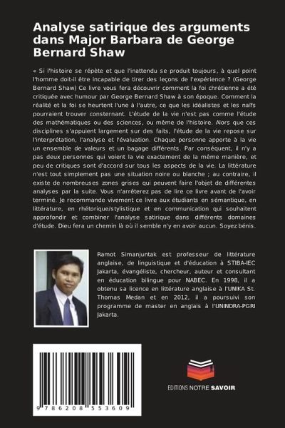« Si l'histoire se répète et que l'inattendu se produit toujours, à quel point l'homme doit-il être incapable de tirer des leçons de l'expérience ? (George Bernard Shaw) Ce livre vous fera découvrir comment la foi chrétienne a été critiquée avec humour par George Bernard Shaw à son époque. Comment la réalité et la foi se heurtent l'une à l'autre, ce que les idéalistes et les naïfs pourraient trouver consternant. L'étude de la vie n'est pas comme l'étude des mathématiques ou des sciences, ou même de l'histoire. Alors que ces disciplines s'appuient largement sur des faits, l'étude de la vie repose sur l'interprétation, l'analyse et l'évaluation. Chaque personne apporte à la vie un ensemble de valeurs et un bagage différents. Par conséquent, il n'y a pas deux personnes qui voient la vie exactement de la même manière, et peu de critiques sont d'accord sur tous les aspects de la vie. La littérature n'est tout simplement pas une situation noire ou blanche ; au contraire, il existe de nombreuses zones grises qui peuvent faire l'objet de différentes analyses par la suite. Vous n'arrêterez pas de lire ce livre avant de l'avoir terminé. Je recommande vivement ce livre aux étudiants en sémantique, en littérature, en rhétorique/stylistique et en communication qui souhaitent approfondir et combiner l'analyse satirique dans différents domaines d'étude. Dieu fera un chemin là où il semble n'y en avoir aucun. Soyez bénis.