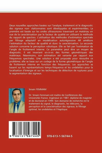 Deux nouvelles approches basées sur l'analyse, traitement et le diagnostic des signaux non- stationnaires sont développées et expérimentées. La première est basée sur les ondes ultrasonores traversant un matériau en vue de la caractérisation par le facteur de qualité en utilisant la méthode du rapport de spectres. L'utilisation des méthodes d'estimation spectrale par filtrage adaptatif en modélisation autorégressive AR améliore l'estimation du facteur de qualité et donc la caractérisation. La seconde solution concerne la perception robotique. Elle se fait par l'estimation de l'angle de frottement interne. Ce paramètre peut être un moyen de diagnostic. Il est invariant vis-à-vis des formes géométriques des matériaux. Néanmoins, son estimation est variante par rapport aux fréquences spectrales. Une solution a été proposée pour résoudre ce problème; elle se base sur un codage de la forme géométrique de l'angle de frottement interne en fonction des fréquences. Les approches se basent sur les représentations temps-fréquence et les ondelettes pour la localisation d'énergie et sur les techniques de détection de ruptures pour la segmentation des signaux.