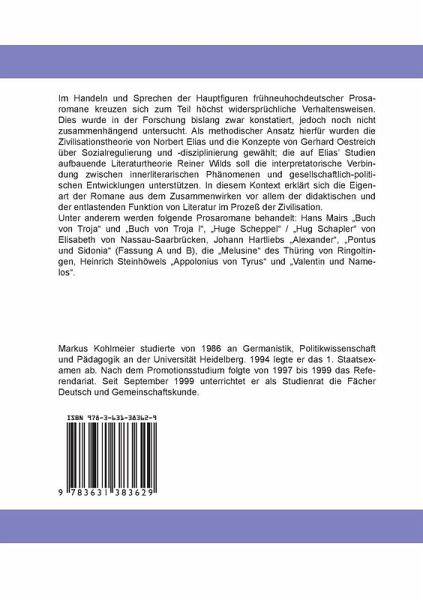 Im Handeln und Sprechen der Hauptfiguren frühneuhochdeutscher Prosaromane kreuzen sich zum Teil höchst widersprüchliche Verhaltensweisen. Dies wurde in der Forschung bislang zwar konstatiert, jedoch noch nicht zusammenhängend untersucht. Als methodischer Ansatz hierfür wurden die Zivilisationstheorie von Norbert Elias und die Konzepte von Gerhard Oestreich über Sozialregulierung und -disziplinierung gewählt; die auf Elias' Studien aufbauende Literaturtheorie Reiner Wilds soll die interpretatorische Verbindung zwischen innerliterarischen Phänomenen und gesellschaftlich-politischen Entwicklungen unterstützen. In diesem Kontext erklärt sich die Eigenart der Romane aus dem Zusammenwirken vor allem der didaktischen und der entlastenden Funktion von Literatur im Prozeß der Zivilisation.