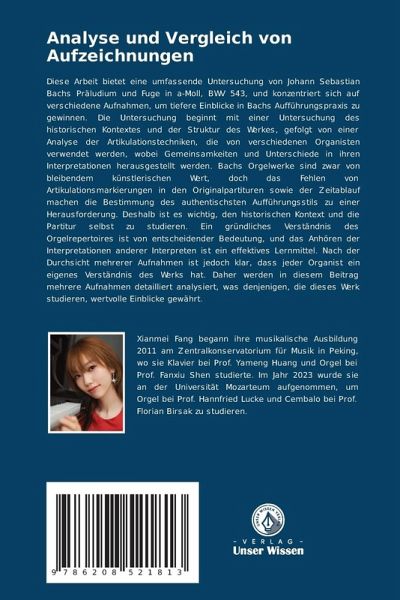 Diese Arbeit bietet eine umfassende Untersuchung von Johann Sebastian Bachs Präludium und Fuge in a-Moll, BWV 543, und konzentriert sich auf verschiedene Aufnahmen, um tiefere Einblicke in Bachs Aufführungspraxis zu gewinnen. Die Untersuchung beginnt mit einer Untersuchung des historischen Kontextes und der Struktur des Werkes, gefolgt von einer Analyse der Artikulationstechniken, die von verschiedenen Organisten verwendet werden, wobei Gemeinsamkeiten und Unterschiede in ihren Interpretationen herausgestellt werden. Bachs Orgelwerke sind zwar von bleibendem künstlerischen Wert, doch das Fehlen von Artikulationsmarkierungen in den Originalpartituren sowie der Zeitablauf machen die Bestimmung des authentischsten Aufführungsstils zu einer Herausforderung. Deshalb ist es wichtig, den historischen Kontext und die Partitur selbst zu studieren. Ein gründliches Verständnis des Orgelrepertoires ist von entscheidender Bedeutung, und das Anhören der Interpretationen anderer Interpreten istein effektives Lernmittel. Nach der Durchsicht mehrerer Aufnahmen ist jedoch klar, dass jeder Organist ein eigenes Verständnis des Werks hat. Daher werden in diesem Beitrag mehrere Aufnahmen detailliert analysiert, was denjenigen, die dieses Werk studieren, wertvolle Einblicke gewährt.