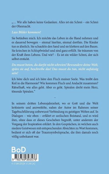"... Wir alle haben keine Gedanken. Alles ist ein Schrei - ein Schrei der Ohnmacht. Lass Bilder kommen! Sie betäuben mich. Ich möchte das Leben in die Hand nehmen und es dauernd bewegen - einmal hierhin, einmal dorthin. Die Kinder tun es ähnlich. Sie schaufeln den Sand und sie klettern auf den Baum. Sie kriechen in Schlupfwinkel und sind ganz erfüllt. Sie träumen von der Kraft ihres Lebens. Und wir? - Es ist ein wilder Schrei, der sich selbst erstickt. Du musst beten, du darfst nicht schreien! Bewundere deine Welt, spüre sie auf, beschreibe das! Das musst du tun, nicht aufsässig sein! Ich höre dich und ich höre den Fluch meiner Seele. Was treibt den Keil in die Harmonie? Wie kommen Fluch und Andacht zusammen? Rätselhaft, wie alles geht. Aber es geht. Spiralen dreht mein Herz, tönende Spiralen." - In seinem dritten Lebensjahrzehnt, wo er Gott und die Welt kritisierte und anzweifelte, nahm der Autor im Rahmen seiner Tagebuchführung unbewusst Verbindung zu geistigen Welten auf. In Dialogen - wie oben - erfährt er seelischen Beistand, und es wird ihm, ohne dass er dieses Geschehen begreift, unter anderem der Vorgang der Inspiration erklärt. In den Gesprächen, in welchen auch niedere Geistwesen mit entsprechenden Absichten zu Wort kommen, bedient er sich oft der Traumsymbolsprache, die ihm damals noch völlig unbekannt war.