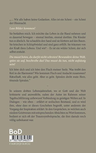 "... Wir alle haben keine Gedanken. Alles ist ein Schrei - ein Schrei der Ohnmacht. Lass Bilder kommen! Sie betäuben mich. Ich möchte das Leben in die Hand nehmen und es dauernd bewegen - einmal hierhin, einmal dorthin. Die Kinder tun es ähnlich. Sie schaufeln den Sand und sie klettern auf den Baum. Sie kriechen in Schlupfwinkel und sind ganz erfüllt. Sie träumen von der Kraft ihres Lebens. Und wir? - Es ist ein wilder Schrei, der sich selbst erstickt. Du musst beten, du darfst nicht schreien! Bewundere deine Welt, spüre sie auf, beschreibe das! Das musst du tun, nicht aufsässig sein! Ich höre dich und ich höre den Fluch meiner Seele. Was treibt den Keil in die Harmonie? Wie kommen Fluch und Andacht zusammen? Rätselhaft, wie alles geht. Aber es geht. Spiralen dreht mein Herz, tönende Spiralen." - In seinem dritten Lebensjahrzehnt, wo er Gott und die Welt kritisierte und anzweifelte, nahm der Autor im Rahmen seiner Tagebuchführung unbewusst Verbindung zu geistigen Welten auf. In Dialogen - wie oben - erfährt er seelischen Beistand, und es wird ihm, ohne dass er dieses Geschehen begreift, unter anderem der Vorgang der Inspiration erklärt. In den Gesprächen, in welchen auch niedere Geistwesen mit entsprechenden Absichten zu Wort kommen, bedient er sich oft der Traumsymbolsprache, die ihm damals noch völlig unbekannt war.