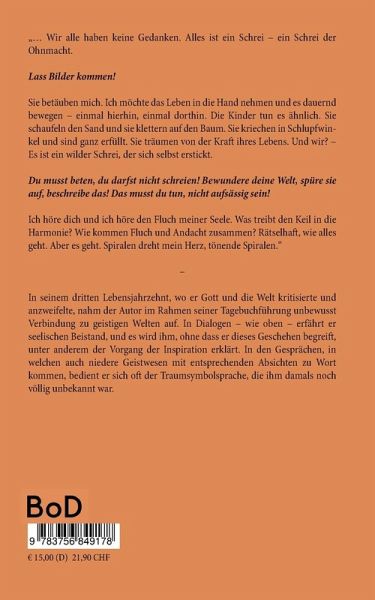 "... Wir alle haben keine Gedanken. Alles ist ein Schrei - ein Schrei der Ohnmacht. Lass Bilder kommen!Sie betäuben mich. Ich möchte das Leben in die Hand nehmen und es dauernd bewegen - einmal hierhin, einmal dorthin. Die Kinder tun es ähnlich. Sie schaufeln den Sand und sie klettern auf den Baum. Sie kriechen in Schlupfwinkel und sind ganz erfüllt. Sie träumen von der Kraft ihres Lebens. Und wir? - Es ist ein wilder Schrei, der sich selbst erstickt. Du musst beten, du darfst nicht schreien! Bewundere deine Welt, spüre sie auf, beschreibe das! Das musst du tun, nicht aufsässig sein! Ich höre dich und ich höre den Fluch meiner Seele. Was treibt den Keil in die Harmonie? Wie kommen Fluch und Andacht zusammen? Rätselhaft, wie alles geht. Aber es geht. Spiralen dreht mein Herz, tönende Spiralen." -In seinem dritten Lebensjahrzehnt, wo er Gott und die Welt kritisierte und anzweifelte, nahm der Autor im Rahmen seiner Tagebuchführung unbewusst Verbindung zu geistigen Welten auf. In Dialogen - wie oben - erfährt er seelischen Beistand, und es wird ihm, ohne dass er dieses Geschehen begreift, unter anderem der Vorgang der Inspiration erklärt. In den Gesprächen, in welchen auch niedere Geistwesen mit entsprechenden Absichten zu Wort kommen, bedient er sich oft der Traumsymbolsprache, die ihm damals noch völlig unbekannt war.