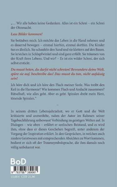 "... Wir alle haben keine Gedanken. Alles ist ein Schrei - ein Schrei der Ohnmacht. Lass Bilder kommen!Sie betäuben mich. Ich möchte das Leben in die Hand nehmen und es dauernd bewegen - einmal hierhin, einmal dorthin. Die Kinder tun es ähnlich. Sie schaufeln den Sand und sie klettern auf den Baum. Sie kriechen in Schlupfwinkel und sind ganz erfüllt. Sie träumen von der Kraft ihres Lebens. Und wir? - Es ist ein wilder Schrei, der sich selbst erstickt. Du musst beten, du darfst nicht schreien! Bewundere deine Welt, spüre sie auf, beschreibe das! Das musst du tun, nicht aufsässig sein! Ich höre dich und ich höre den Fluch meiner Seele. Was treibt den Keil in die Harmonie? Wie kommen Fluch und Andacht zusammen? Rätselhaft, wie alles geht. Aber es geht. Spiralen dreht mein Herz, tönende Spiralen." -In seinem dritten Lebensjahrzehnt, wo er Gott und die Welt kritisierte und anzweifelte, nahm der Autor im Rahmen seiner Tagebuchführung unbewusst Verbindung zu geistigen Welten auf. In Dialogen - wie oben - erfährt er seelischen Beistand, und es wird ihm, ohne dass er dieses Geschehen begreift, unter anderem der Vorgang der Inspiration erklärt. In den Gesprächen, in welchen auch niedere Geistwesen mit entsprechenden Absichten zu Wort kommen, bedient er sich oft der Traumsymbolsprache, die ihm damals noch völlig unbekannt war.