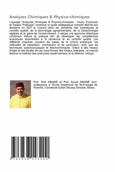 L'ouvrage "Analyses Chimiques & Physico-chimiques : Cours, Exercices et Travaux Pratiques" constitue un guide pédagogique complet destiné aux étudiants en DUT et Licence dans les domaines des bioanalyses et contrôle qualité, de la technologie agroalimentaire, de la biotechnologie végétale et du génie de l'environnement. Il adopte une approche didactique combinant théorie et pratique afin de développer les compétences analytiques essentielles à la recherche et au contrôle qualité. Les différents chapitres couvrent les bases de la chimie analytique, les méthodes de séparation, d'extraction et de purification, ainsi que les techniques spectroscopiques et électrochimiques. Grâce à des travaux dirigés et des études de cas sous-formes des travaux pratiques, ce manuel favorise la maîtrise des protocoles expérimentaux et la réflexion critique.
