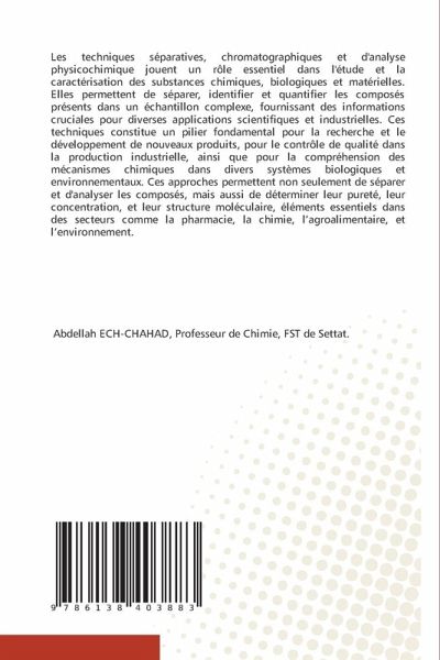 Les techniques séparatives, chromatographiques et d'analyse physicochimique jouent un rôle essentiel dans l'étude et la caractérisation des substances chimiques, biologiques et matérielles. Elles permettent de séparer, identifier et quantifier les composés présents dans un échantillon complexe, fournissant des informations cruciales pour diverses applications scientifiques et industrielles. Ces techniques constitue un pilier fondamental pour la recherche et le développement de nouveaux produits, pour le contrôle de qualité dans la production industrielle, ainsi que pour la compréhension des mécanismes chimiques dans divers systèmes biologiques et environnementaux. Ces approches permettent non seulement de séparer et d'analyser les composés, mais aussi de déterminer leur pureté, leur concentration, et leur structure moléculaire, éléments essentiels dans des secteurs comme la pharmacie, la chimie, l'agroalimentaire, et l'environnement.