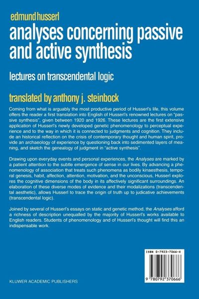 Coming from what is arguably the most productive period of Husserl's life, this volume offers the reader a first translation into English of Husserl's renowned lectures on `passive synthesis', given between 1920 and 1926. These lectures are the first extensive application of Husserl's newly developed genetic phenomenology to perceptual experience and to the way in which it is connected to judgments and cognition. They include an historical reflection on the crisis of contemporary thought and human spirit, provide an archaeology of experience by questioning back into sedimented layers of meaning, and sketch the genealogy of judgment in `active synthesis'.
