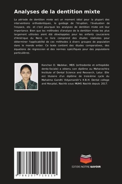 La période de dentition mixte est un moment idéal pour la plupart des interventions orthodontiques, le guidage de l'éruption, l'évaluation de l'espace, etc. et c'est pourquoi les analyses de dentition mixte ont leur importance. Bien que les méthodes d'analyse de la dentition mixte les plus largement utilisées aient été développées pour les enfants caucasiens d'Amérique du Nord, ce livre comprend des études réalisées pour déterminer l'applicabilité de ces méthodes à divers groupes de population dans le monde entier. Ce texte contient des études comparatives, des équations de régression et des normes spécifiques pour des populations particulières.