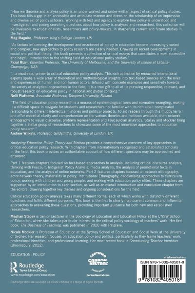 Part 1 features chapters focused on text-based approaches to analysis, including critical discourse analysis, thinking with Foucault, Indigenist Policy Analysis, media analysis, the analysis of promotional texts in education, and the analysis of online networks. Part 2 features chapters focused on network ethnography, actor-network theory, materiality in policy, Institutional Ethnography, decolonising approaches to curriculum policy, working with children and young people, and working with education policy elites. These chapters are supported by an introduction to each section, as well as an overall introduction and conclusion chapter from the editors, drawing together key themes and ongoing considerations for the field.