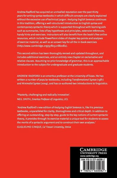 Andrew Radford has acquired an unrivalled reputation over the past thirty years for writing syntax textbooks in which difficult concepts are clearly explained without the excessive use of technical jargon. Analysing English Sentences continues in this tradition, offering a well-structured introduction to English syntax and contemporary syntactic theory which is supported throughout with learning aids such as summaries, lists of key hypotheses and principles, extensive references, handy hints and exercises. Instructors will also benefit from the book's free online resources, which include PowerPoint slides of chapter key points and analyses of exercise material, as well as an answer key for all the in-book exercises. This second edition has been thoroughly revised and updated throughout, including additional exercises and an entirely new chapter on exclamative and relative clauses. Assuming no prior knowledge of grammar, this is an approachable introduction to the subject for undergraduate and graduate students.